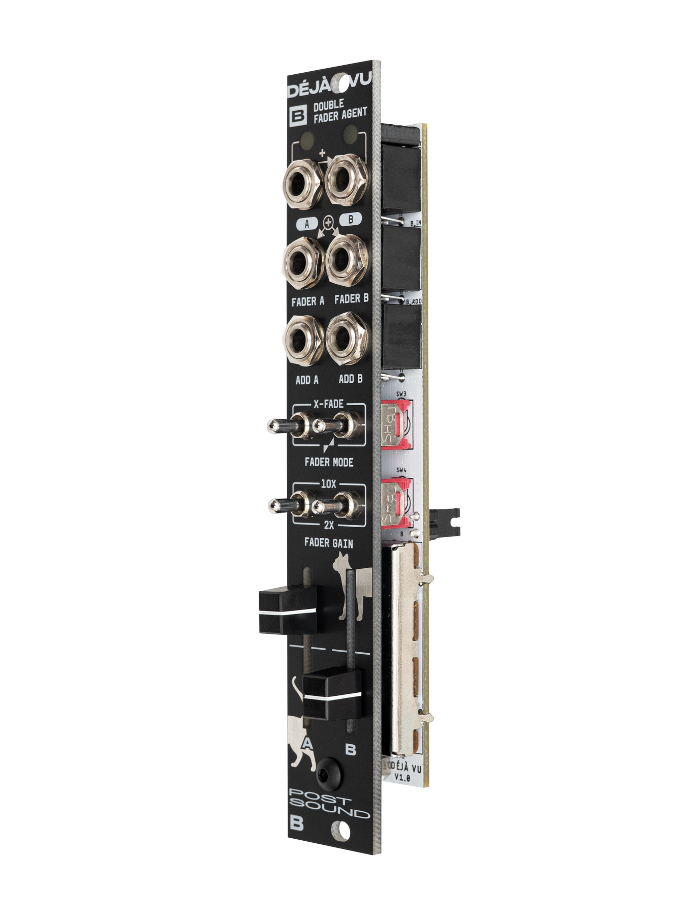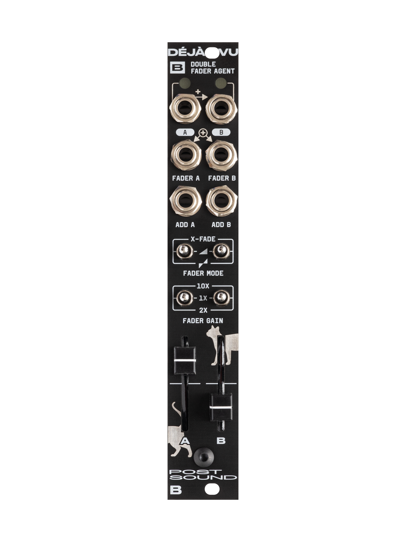 — Crossfader (between FADER and ADD) - Fader gain: 1x, 2x or 10x (10x can be turned into 5X via back jumper)