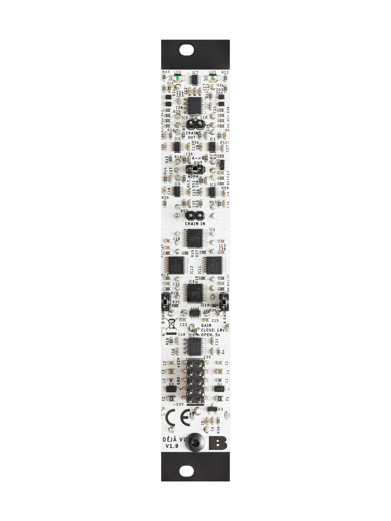 Déjà vu adds fader control to your modular system and it stands out as a simple yet powerful utility module that can do voltage processing, mixing, attenuation, attenuversion, signal boosting, crossfading and mixing. All that in 4HP and with the possibility of chaining several units to mix even more signals.