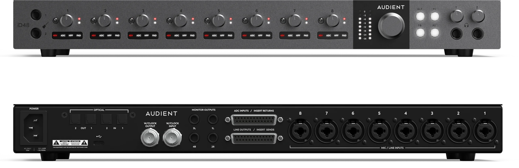 Bigger, better and more powerful than ever, iD48 is the flagship USB iD interface made for producers and engineers. Packing in eight Audient Console Mic Preamps, advanced 32-bit ESS converter technology and the all new Switchable Analogue Insert technology, iD48 seamlessly combines astonishing audio performance with ease of use. Add to that professional must have features like ADAT expandability and customisable monitor control, iD48 is ready to transform your studio.