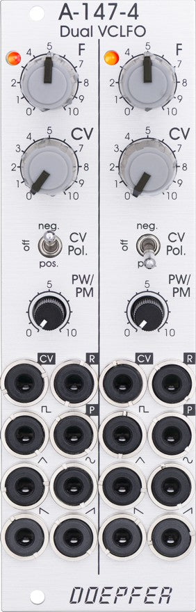 Module A-147-4 is a dual voltage controlled LFO (Low Frequency Oscillator). Each LFO has the five waveforms triangle, sine, rising and falling sawtooth, as well as rectangle available. The rectangle output features manually adjustable pulsewidth and pulsewidth modulation by means of an external control voltage. The core waveform is triangle. The other waveforms are derived from triangle by means of waveform converters. The frequency of each LFO can be adjusted manually and modulated by means of an external control voltage with associated attenuator and polarity switch. By means of a jumper the basic frequency range of each LFO can selected: about 0.02 Hz (~ 50 seconds) ... 2.5kHz or about 0.0017 Hz(~ 600 seconds) ... 220Hz. That way each LFO can be used also as a VCO with a max. frequency of about 2.5kHz. Each LFO features a reset input which can be used to reset the triangle signal.