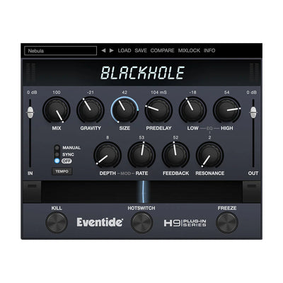 Most reverbs are earth-bound and constrained by the physics of the real world. Our Blackhole reverb breaks the rules by allowing you to create virtual spaces that could never exist in reality (or at least the one we inhabit). At large sizes, its soft attack and lingering, harmonic tails allow it to really shine on guitars, strings, and pads. At small sizes, those very same qualities can add an angelic sheen to vocals or turn a simple drum track into an otherworldly rhythm section.
