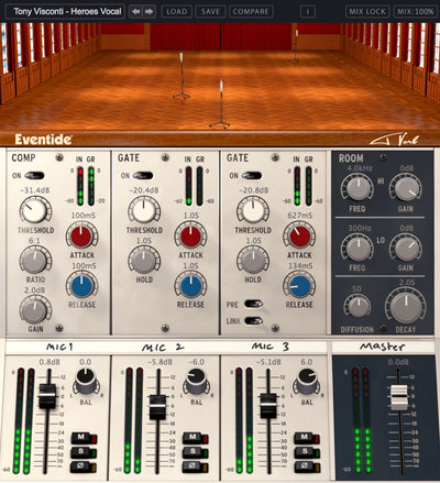 With analog-modeled compression on the main channel and gating on the reverb channels, Tverb is a unique tool for audio with wide dynamic range. The inspiration for the plug-in was the setup Visconti used to capture the incredible dynamic range of David Bowie’s vocals while recording “Heroes.” Tverb builds on Visconti’s technique and opens up undreamed of possibilities.